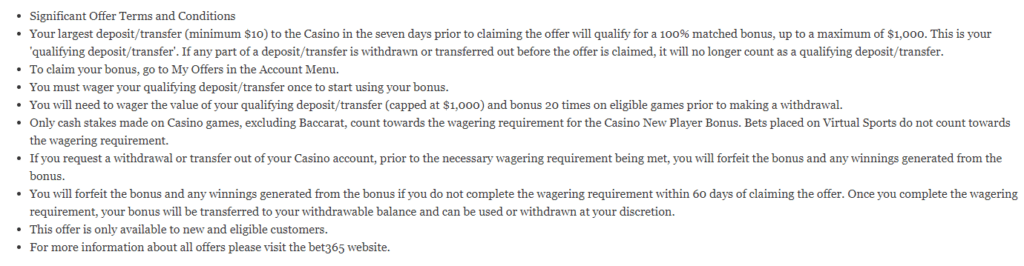 Get off to a flying start in the Casino at bet365 with a New Player Bonus of up to $1,000. Deposit/transfer between $10 and $1,000 and click Claim Now in the My Offers section within the Account Menu. Give your Casino at bet365 account a boost and start playing a great selection of games.